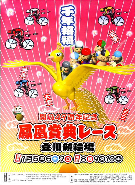 Winners歴代優勝者/記念・特別競輪 Home データルーム:歴代優勝者/記念・特別競輪 立川競輪場開設記念/特別競輪優勝者 本場(立川競輪)開設記念・特別競輪、およびKEIRINグランプリ優勝者等の情報をご覧いただけます。 開設記念/特別競輪 KEIRINグランプリ 立川競輪場開設記念/特別競輪優勝者 開催名 優勝者 2着 レース映像 ポスター/カード画像 開設73周年記念競輪 鳳凰賞典レース (2025年) 山口 拳矢 (岐阜/117期) 郡司 浩平 (神奈川/99期) 開設72周年記念競輪 鳳凰賞典レース (2023年) 森田 優弥 (埼玉/113期) 佐々木 悠葵 (群馬/115期) 開設71周年記念競輪 鳳凰賞典レース (2023年) 新田 祐大 (福島/90期) 北津留 翼 (福岡/90期) 開設70周年記念競輪 鳳凰賞典レース (2022年) 吉田 拓矢 (茨城/107期) 浅井 康太 (三重/90期) 開設69周年記念競輪 鳳凰賞典レース (2021年) 平原 康多 (埼玉/87期) 桑原 大志 (山口/80期) 開設68周年記念競輪 鳳凰賞典レース (2020年) 清水 裕友 (山口/105期) 平原 康多 (埼玉/87期) 開設67周年記念競輪 鳳凰賞典レース (2019年) 清水 裕友 (山口/105期) 浅井 康太 (三重/90期) 開設66周年記念競輪 鳳凰賞典レース (2018年) 平原 康多 (埼玉/87期) 金子 貴志 (愛知/75期) 開設65周年記念競輪 鳳凰賞典レース (2017年) 北津留 翼 (福岡/90期) 岩津 裕介 (岡山/87期) 開設64周年記念競輪 鳳凰賞典レース (2016年) 原田 研太朗 (徳島/98期) 脇本 雄太 (福井/94期) 開設63周年記念競輪 鳳凰賞典レース (2015年) 村上 義弘 (京都/73期) 浅井 康太 (三重/90期) 開設62周年記念競輪 鳳凰賞典レース (2014年) 平原 康多 (埼玉/87期) 神山 雄一郎 (栃木/61期) 第66回日本選手権競輪 (2013年) 村上 義弘 (京都/73期) 深谷 知広 (愛知/96期) 開設60周年記念競輪 鳳凰賞典レース (2012年) 深谷 知広 (愛知/96期) 岩津 裕介 (岡山/87期) 開設59周年記念競輪 鳳凰賞典レース (2011年) 深谷 知広 (愛知/96期) 栗田 雅也 (静岡/84期) 開設58周年記念競輪 鳳凰賞典レース (2010年) 浅井 康太 (三重/90期) 成田 和也 (福島/88期) 開設57周年記念競輪 鳳凰賞典レース (2009年) 渡部 哲男 (愛媛/84期) 加藤 慎平 (岐阜/81期) 開設56周年記念競輪 鳳凰賞典レース (2008年) 紫原 政文 (福岡/61期) 荒井 崇博 (佐賀/82期) 開設55周年記念競輪 鳳凰賞典レース (2007年) 荒井 崇博 (佐賀/82期) 渡邉 晴智 (静岡/73期) 第59回日本選手権競輪 (2006年) 吉岡 稔真 (福岡/65期) 有坂 直樹 (秋田/64期) 開設53周年記念競輪 鳳凰賞典レース (2005年) 市田佳寿浩 (福井/76期) 山口 幸二 (岐阜/62期) 開設52周年記念競輪 鳳凰賞典レース (2004年) 神山雄一郎 (栃木/61期) 小倉 竜二 (徳島/77期) 開設51周年記念競輪 鳳凰賞典レース (2003年) 伏見 俊昭 (福島/75期) 児玉 広志 (香川/66期) 第55回 日本選手権競輪 (2002年) 山田 裕仁 (岐阜/61期) 内林 久徳 (滋賀/62期) 開設49周年記念競輪 鳳凰賞典レース 後節 (2001年) 山口 幸二 (岐阜/62期) 松岡 彰洋 (三重/69期) 開設49周年記念競輪 鳳凰賞典レース 前節 (2001年) 佐久間 仙行 (東京/62期) 東出 剛 (千葉/54期) 開設48周年記念競輪 鳳凰賞典レース 後節 (2000年) 神山雄一郎 (栃木/61期) 山口 幸二 (岐阜/62期) 開設48周年記念競輪 鳳凰賞典レース 前節 (2000年) 鈴木 誠 (千葉/55期) 高木 隆弘 (神奈川/64期) 開設47周年記念競輪 鳳凰賞典レース 後節 (1999年) 出口 眞浩 (神奈川/63期) 児玉 広志 (香川/66期) 開設47周年記念競輪 鳳凰賞典レース 前節 (1999年) 小嶋 敬二 (石川/74期) 波潟 和男 (東京/57期) 開設46周年記念競輪 鳳凰賞典レース 後節 (1998年) 鰐渕 正利 (愛知/65期) 金古 将人 (福島/67期) 開設46周年記念競輪 鳳凰賞典レース 前節 (1998年) 降雪のため中止 開設45周年記念競輪 鳳凰賞典レース 後節 (1997年) 東出 剛 (千葉/54期) 高谷 雅彦 (青森/67期) 開設45周年記念競輪 鳳凰賞典レース 前節 (1997年) 山田 裕仁 (岐阜/61期) 児玉 広志 (香川/66期) 開設44周年記念競輪 鳳凰賞典レース 後節 (1996年) 神山雄一郎 (栃木/61期) 幸田 光博 (栃木/67期) 開設44周年記念競輪 鳳凰賞典レース 前節 (1996年) 吉岡 稔真 (福岡/65期) 森内 章之 (熊本/64期) 開設43周年記念競輪 鳳凰賞典レース 後節 (1995年) 尾崎 雅彦 (東京/39期) 恩田 繁雄 (東京/41期) 開設43周年記念競輪 鳳凰賞典レース 前節 (1995年) 小橋 正義 (岡山/59期) 紫原 政文 (福岡/61期) 開設42周年記念競輪 鳳凰賞典レース 後節 (1994年) 滝澤 正光 (千葉/43期) 三宅 伸 (岡山/64期) 開設42周年記念競輪 鳳凰賞典レース 前節 (1994年) 神山雄一郎 (栃木/61期) 鈴木 誠 (千葉/55期) 第46回 日本選手権競輪 (1993年) 海田 和裕 (三重/65期) 遠澤 健二 (神奈川/57期) 開設40周年記念競輪 鳳凰賞典レース 後節 (1992年) 佐々木昭彦 (佐賀/43期) 金田健一郎 (大阪/60期) 開設40周年記念競輪 鳳凰賞典レース 前節 (1992年) 鈴木 誠 (千葉/55期) 井上 茂徳 (佐賀/41期) 開設39周年記念競輪 鳳凰賞典レース 後節 (1991年) 鈴木 誠 (千葉/55期) 平田 崇昭 (福岡/55期) 開設39周年記念競輪 鳳凰賞典レース 前節 (1991年) 中野 浩一 (福岡/35期) 山口 健治 (東京/38期) 開設38周年記念競輪 鳳凰賞典レース 後節 (1990年) 滝澤 正光 (千葉/43期) 山口 健治 (東京/38期) 開設38周年記念競輪 鳳凰賞典レース 前節 (1990年) 神山雄一郎 (栃木/61期) 阿